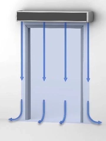 An AIR CURTAIN is a modern device which, when installed on a door, forms an invisible curtain of continuous air and thus prevents escape of conditioned air and entry of outside hot, humid, dirty and unwanted polluted air. It, therefore, not only cuts down electricity bills being a thermal barrier, but also helps in maintenance of cleanliness and hygiene to the required standard.